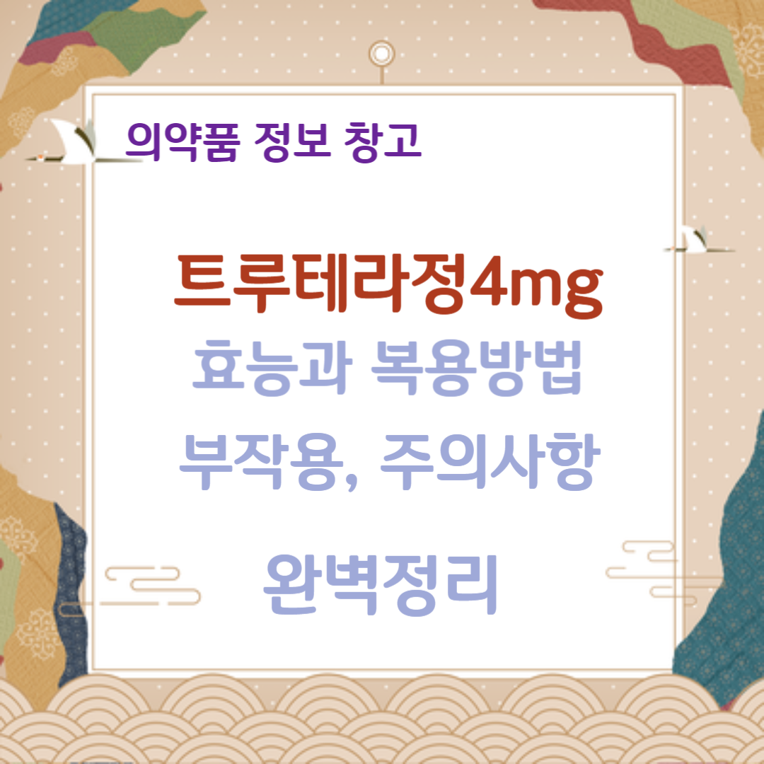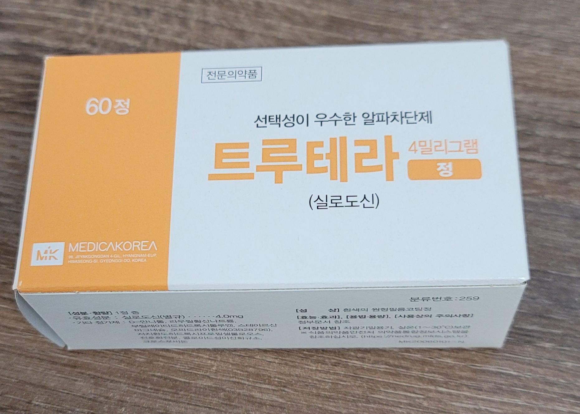 트루테라 4mg은 전립선 비대증에 수반하는 배뇨장애 치료를 위한 약물입니다. 주성분은 실로도신(Silodosin)이며, 선택적 알파차단제 계열의 약물입니다. 메디카코리아 제약회사에서 생산하고 있습니다.