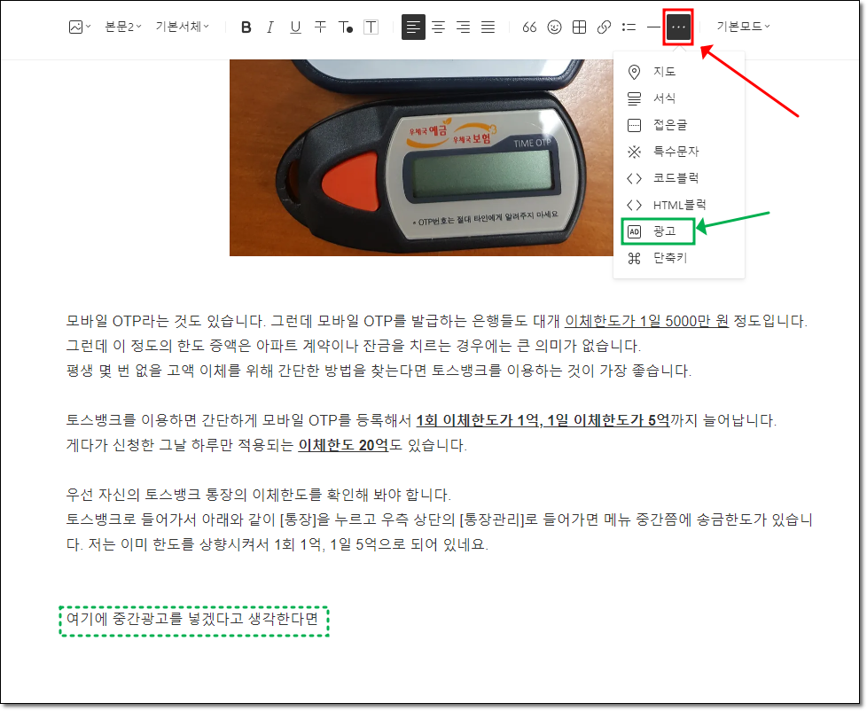 글을 작성하는 에디터 화면에서 중간광고를 넣고자 하는 위치에 마우스를 두고 우측 상단의 점 3개를 누릅니다. 그때 나타나는 메뉴 중에서 [광고]를 누르면 됩니다. 그렇게 하면 커서 위치에 애드센스 중간광고가 들어가게 됩니다.